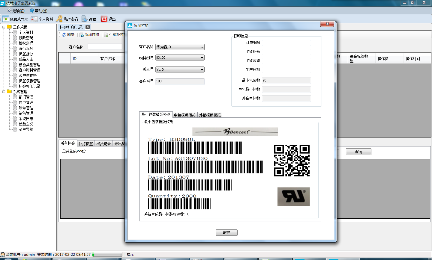 1)、帶產(chǎn)品型號打印標(biāo)簽參數(shù)設(shè)置功能,能夠設(shè)置產(chǎn)品型號 與最小包裝數(shù)量,能夠系統(tǒng)自動生成每個型號的標(biāo)簽數(shù)量;