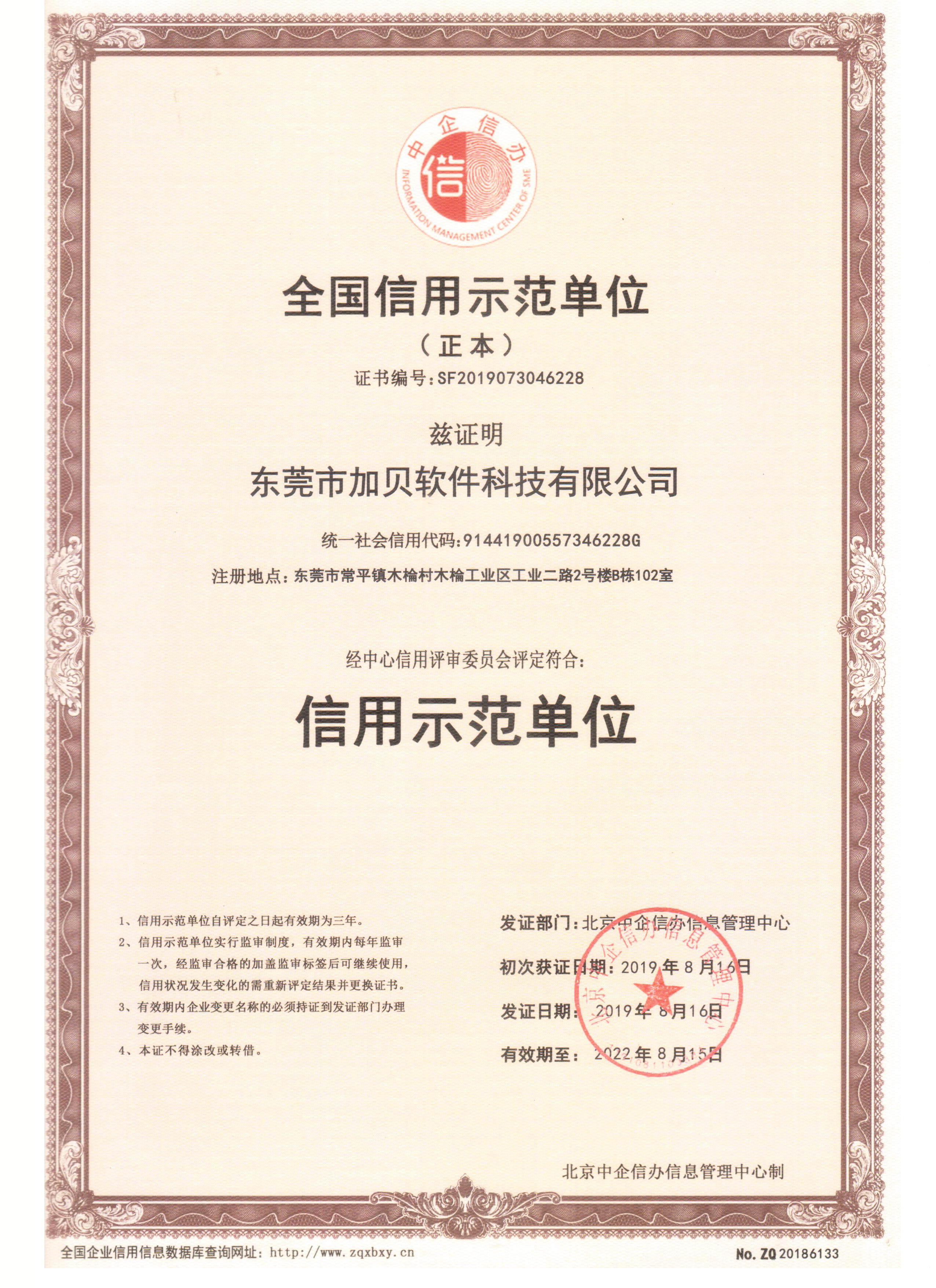 北京中企信辦信息管理中心 8 月 15 日在中企信辦上發(fā)布中國誠信企業(yè)示范單位,加貝軟件憑借多年良好的業(yè)界口碑和優(yōu)秀的服務(wù)品質(zhì)榮獲 2019-2022 年“中國軟件誠信示范單位”榮譽(yù)稱號。