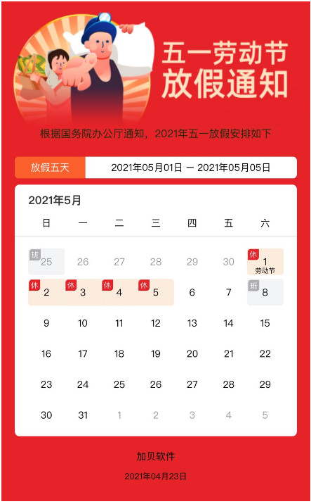 2021年五一勞動(dòng)節(jié)即將來臨,根據(jù)國(guó)務(wù)院《全國(guó)勞動(dòng)節(jié)放假辦法》的規(guī)定,并結(jié)合本公司(加貝軟件)實(shí)際情況與工作安排,經(jīng)公司研究決定,現(xiàn)將勞動(dòng)節(jié)放假時(shí)間安排如下: