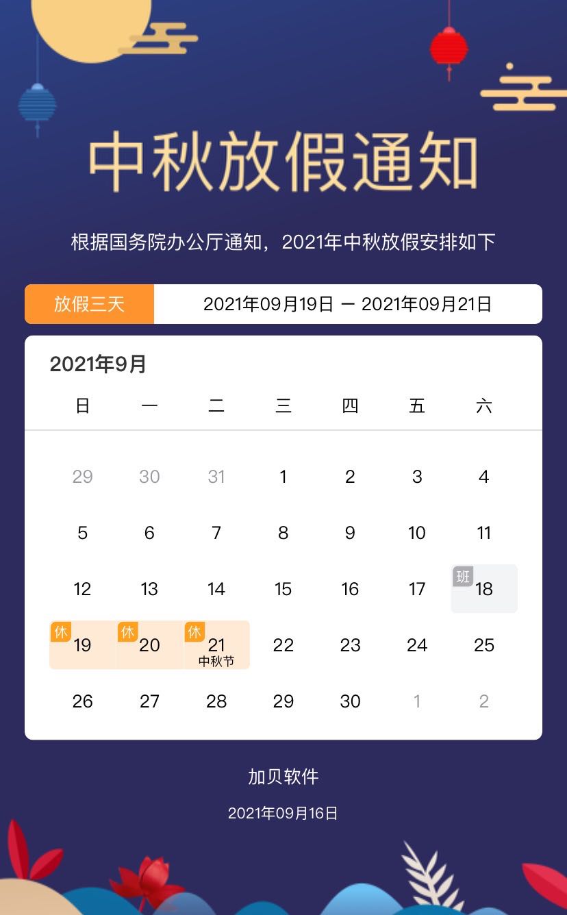 2021年9月19日至2021年9月21日放假,9月18日上班。